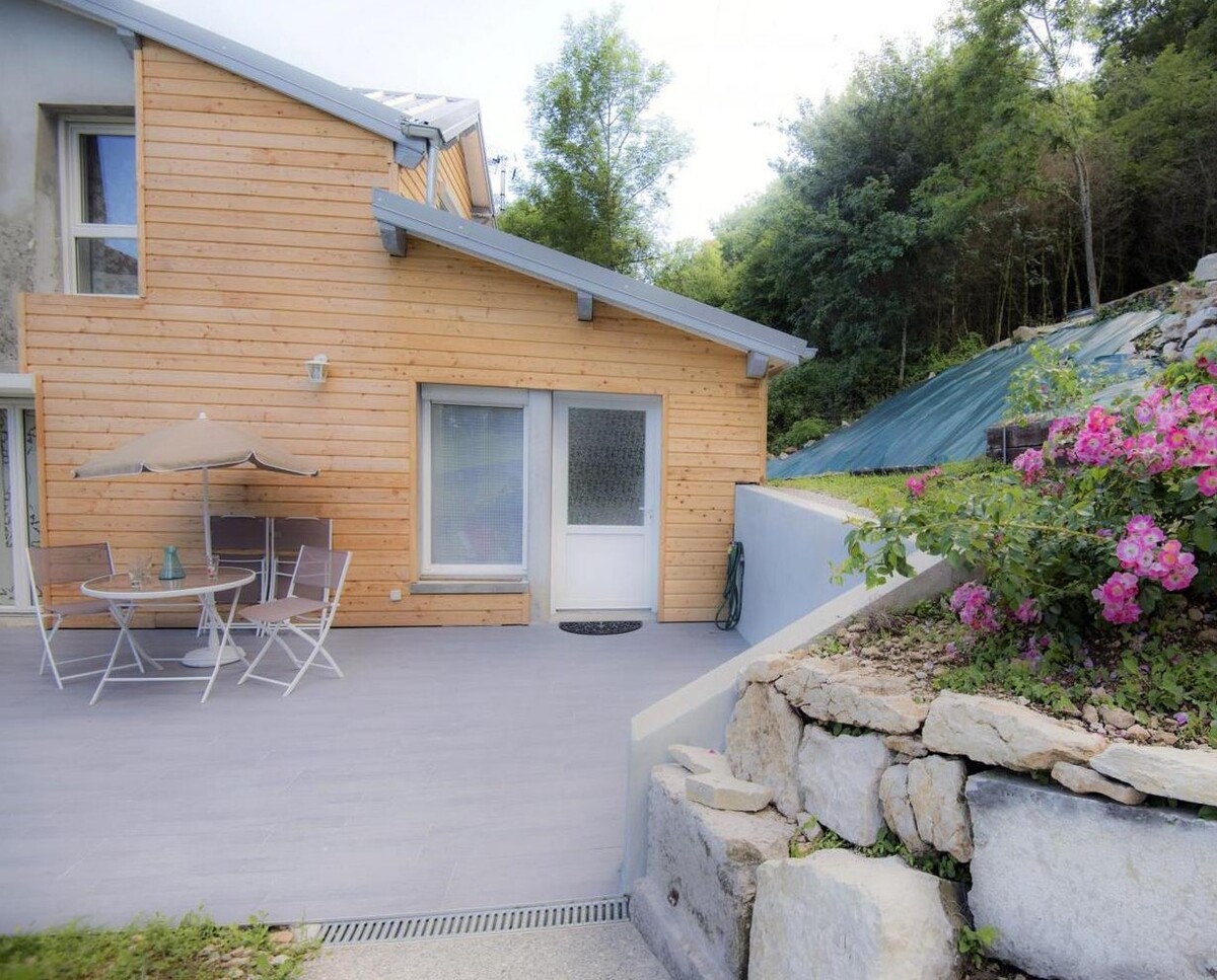 Scteur Culoz. Jolie maison meublée de 41.32m² habs, cuisine ouverte sur salon, SDE/WC, chambre, terrasse, abri de jardin et 1 place de stationnement privative. Belles prestations. Dispo. début mars 2026.